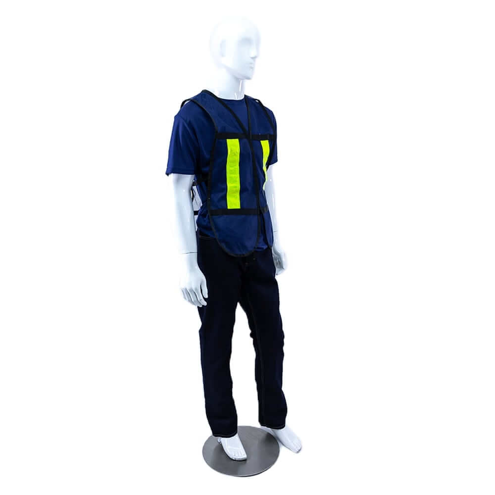 Pantalón de mezclilla/vestir, playera dryfit en cuello redondo, chaleco reflejante.